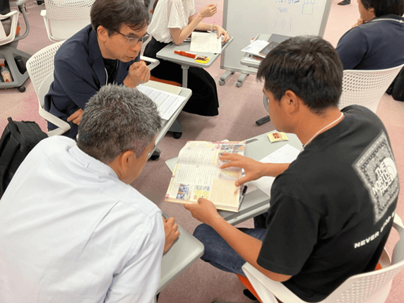 ▲ホワイトボードや持参した教科書を囲んで授業作りの議論を交わす先生方