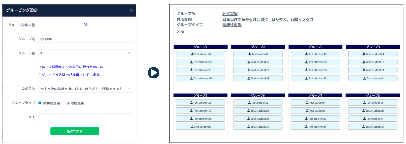 グルーピング機能では、コンピテンシーに基づいて先生方は一切の負担なく全自動でグルーピングできることが大きなメリットです。ときには、先生方の見方とは異なる組み合わせの方がうまく回ることもあります。データが示す新しい可能性に目を向けることで、これまでにない発見があるかもしれません。